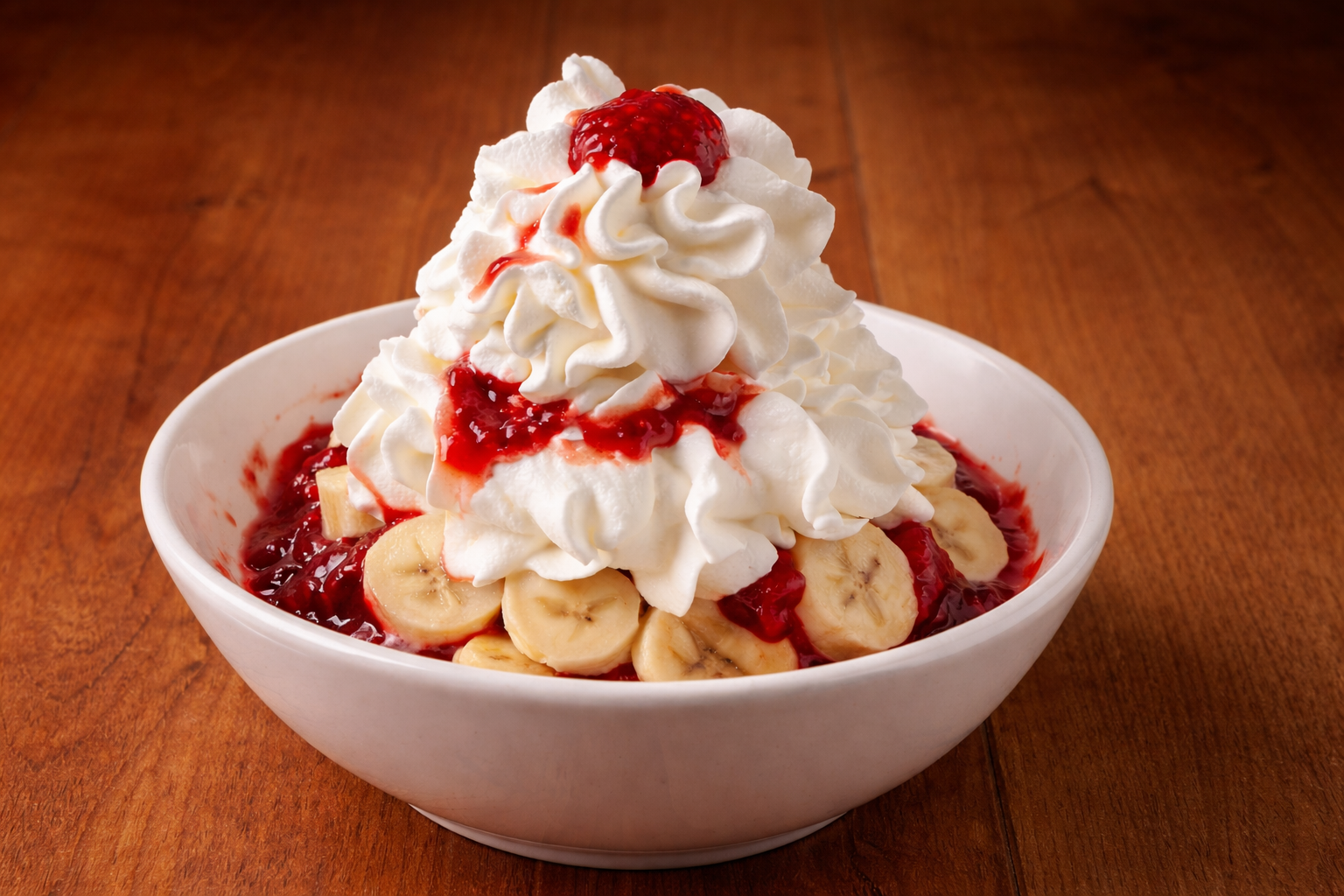 Raspberry sauce, two huge scoops of Gunther’s vanilla ice cream, banana slices, and topped with our homemade whipped cream.